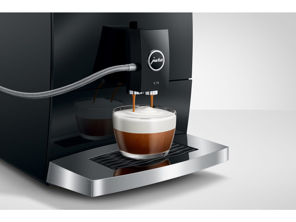 Jura C9 umožňuje detailní přizpůsobení každého nápoje podle osobních preferencí. Uživatel si může nastavit intenzitu aroma, množství kávy a mléka i teplotu nápoje. Praktická přihrádka na mletou kávu je ideální pro přípravu bezkofeinových specialit bez nutnosti měnit zrnkovou kávu.